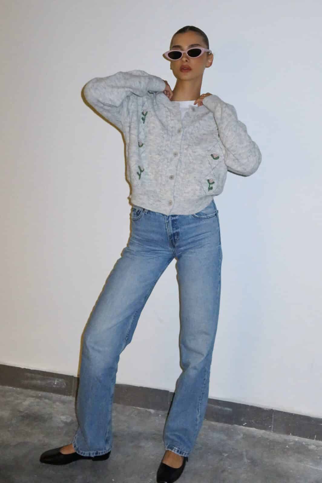 קרדיגן סריג מיוחד עבודת יד. עם פרחים סרוגים ושיבוצי פנינה. מידות ONE SIZE 34-40.